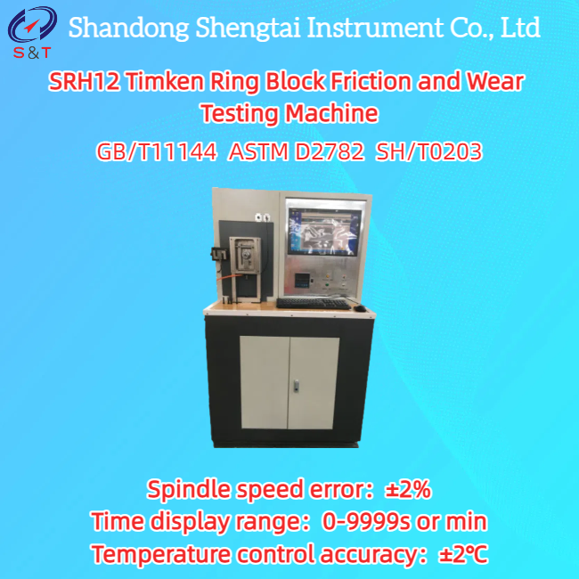 Die SRH12 Timken Ring-Block-Reibungs- und Verschleißprüfmaschine, auch bekannt als Timken-Prüfmaschine, misst die Tragfähigkeit verschiedener Schmierstoffe (Schmieröl, Schmierfett und Festschmierstofffilm): Unter festgelegten Prüfbedingungen wird die maximale Prüfkraft, der der Schmierstoff standhalten kann, bevor der Ölfilm reißt, mit dem OK-Wert verglichen, der der nationalen Norm SHT0203-1992 zur Messung der Extreme-Pressure-Eigenschaften von Schmierfetten (Timken-Prüfmaschinenmethode) entspricht. Die Reibungs- und Verschleißleistung der Probe wird durch Linienkontakt-Gleitreibung geprüft. Das Arbeitsprinzip besteht darin, dass die aktive Komponente ein rotierender Standardring ist und die passive Komponente ein fester rechteckiger Block mit Standardgröße ist. Durch Messung der Breite der streifenförmigen Verschleißmarkierungen auf dem rechteckigen Block der passiven Probe unter verschiedenen Belastungen sowie der Reibungskraft und des Reibungskoeffizienten zwischen den Reibpaarungsmaterialien werden die Tragfähigkeit des Schmierstoffs und die Reibungs- und Verschleißleistung der Reibpaarungsmaterialien bewertet. Es kann die Schmierleistung verschiedener Schmierstoffe unter Ölbadschmierungsbedingungen bewerten, ist besonders geeignet zur Simulation der Anti-Kratz-Eigenschaften von mittel- und hochfesten Automobilgetriebeölen und kann zur Untersuchung der Verschleißleistung verschiedener metallischer, nichtmetallischer Materialien und Beschichtungen verwendet werden.