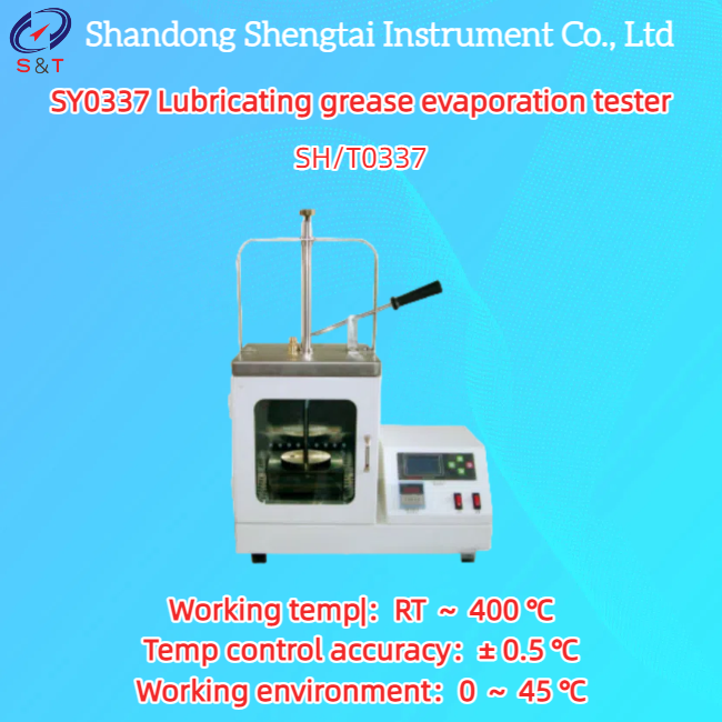 SY0337 Prüfgerät für die Verdunstung von Schmierfett Dieses Gerät ist nach der Norm SH/T0337 konzipiert und hergestellt und eignet sich zur Messung der Verdunstung von Schmierfett. Place an evaporating dish filled with 1mm thick lubricating grease in a specialized thermostat and maintain it at the specified temperature for 1 hour (or as specified in the lubricating grease product standard) to measure the mass loss.