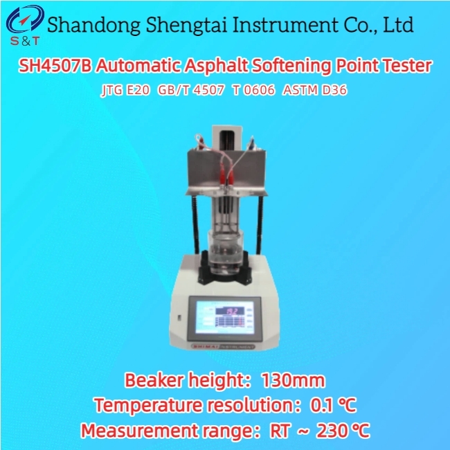 Der automatische Asphalt-Erweichungspunkt-Tester SH4507B wurde gemäß den Anforderungen der Industriestandards JTG E20 "Test Code for Asphalt and Asphalt Mixtures in Highway Engineering" (T 0606 "Asphalt Softening Point Test (Global Method)" und GB/T 4507 "Determination of Softening Point of Petroleum Asphalt" der Volksrepublik China entwickelt und hergestellt.