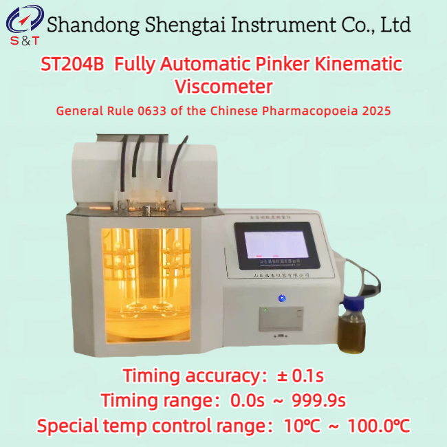 The ST204B fully automatic Ping's kinematic viscometer is designed and manufactured for the first method of viscosity determination in General Rule 0633 of the Chinese Pharmacopoeia in 2025. This method uses the relative method to measure the time required for a certain volume of liquid to flow through a capillary under the action of gravity, in order to obtain the kinematic viscosity of the fluid.