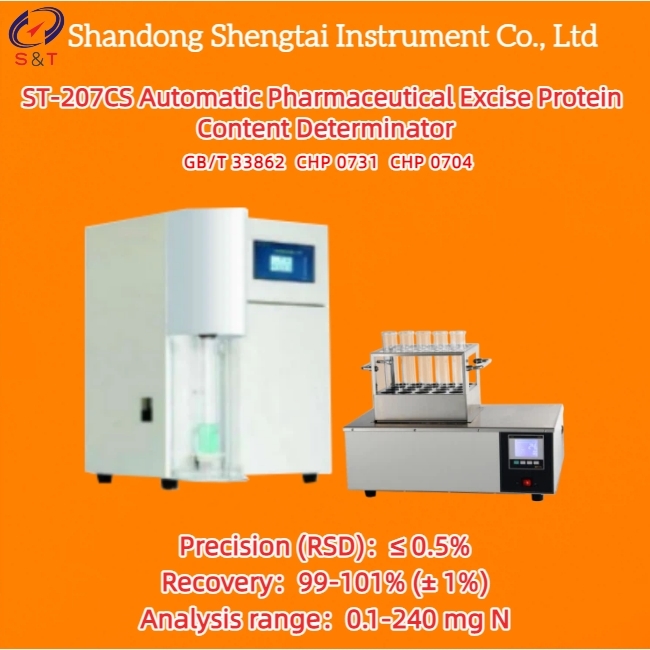 Der ST-207CS Automatischer pharmazeutischer Proteinbestimmer ist ein vollautomatisches "Stickstoff" (Protein) Analysesystem, das auf der klassischen Kjetliner-Stickstoffbestimmungstechnologie und der Farbmethode zur Endpunktbestimmung basiert. Seine Methode und Herstellung entsprechen der Norm GB/T 33862-2017 Voll- (Halb-) Automatischer Kjetliner-Stickstoffbestimmer und der chinesischen Pharmakopöe 2020, 0731 Proteinbestimmungsmethode I Kjetliner-Stickstoffbestimmungsmethode und 0704 Stickstoffbestimmungsmethode III Stickstoffbestimmungsmethode.